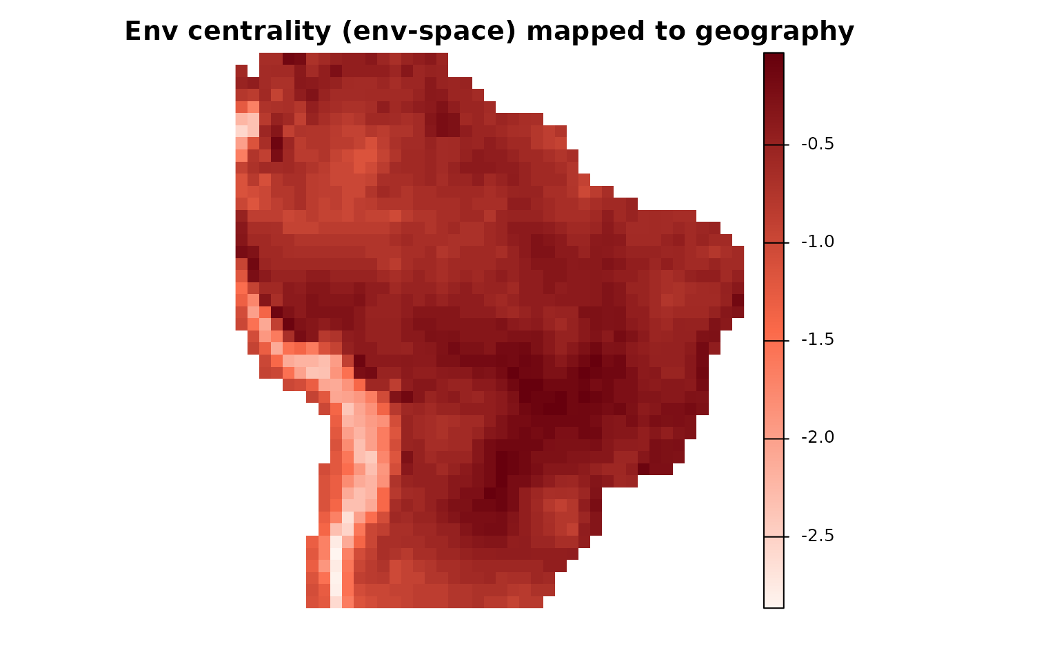 These projections reveal how a descriptor computed in environmental space (centrality) distributes across geographic communities and trait space.
