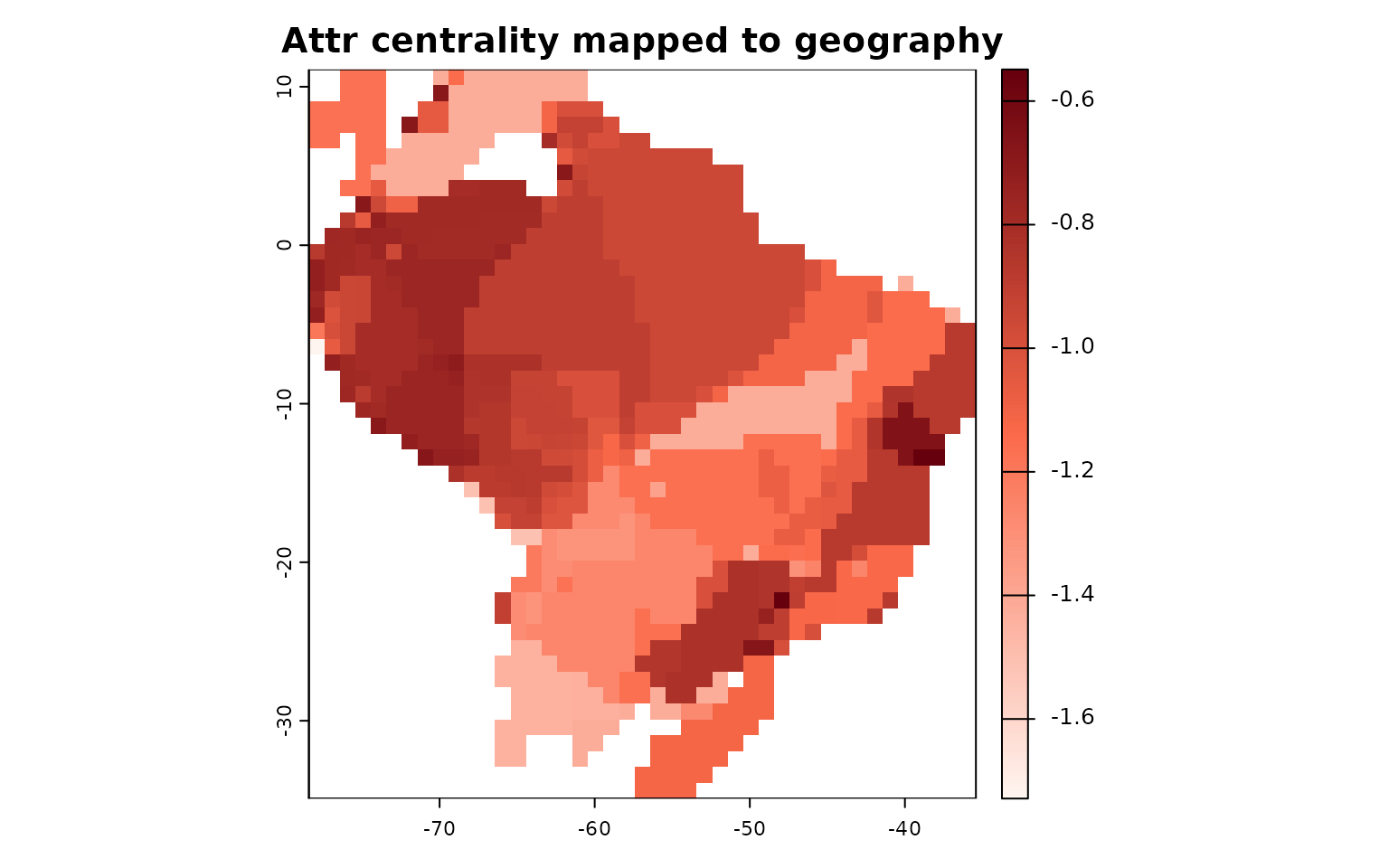 plot(geo_from_attr$Raster, main = "Attr centrality mapped to geography", col = colfunc(200))